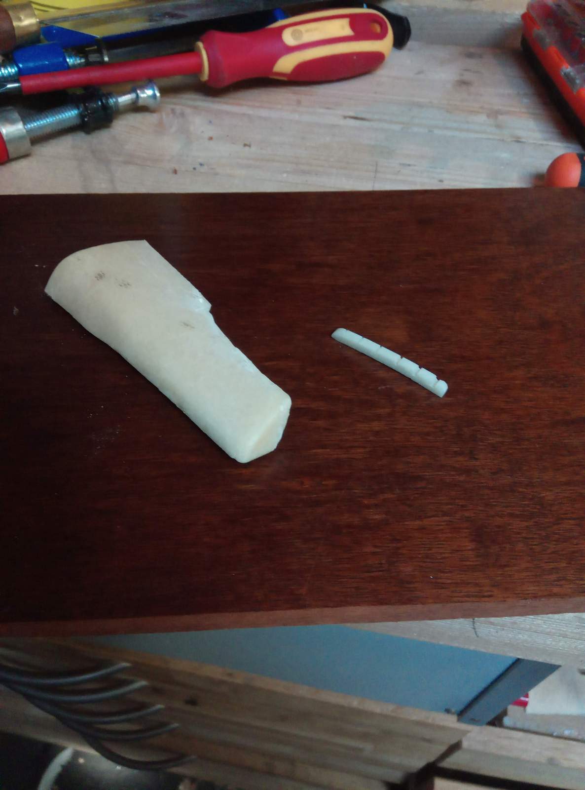 Links op de foto het ruwe stuk been en rechts het eindresultaat. Een topkam van been is populair vanwege de goeie klankeigenschappen.